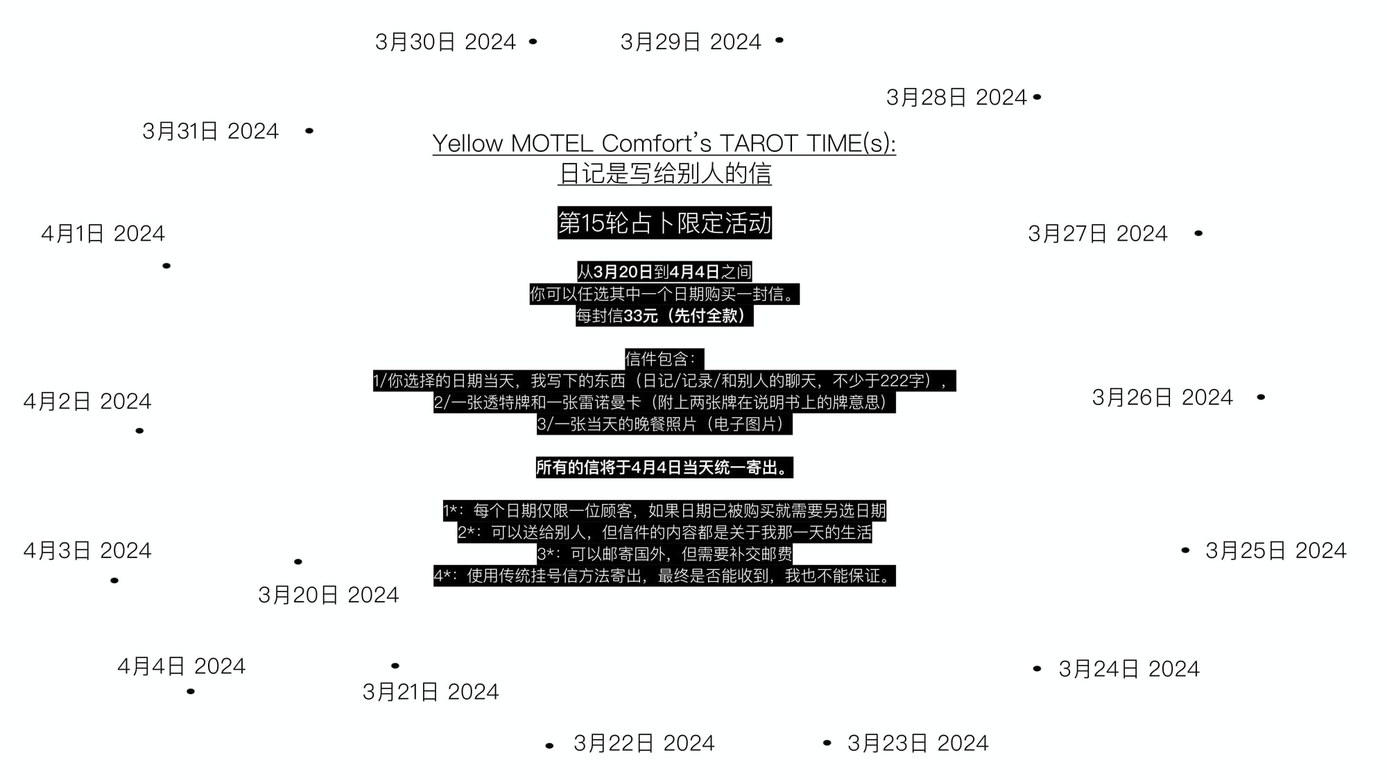 在 3 月 20 日至 4 月 4 日之间,每一天写一封信和抽一张塔罗牌与雷诺曼牌寄给你。(在那一天没开始之前,我也不知道你会收到什么样的生活截屏,4 月 4 日统一寄出。)