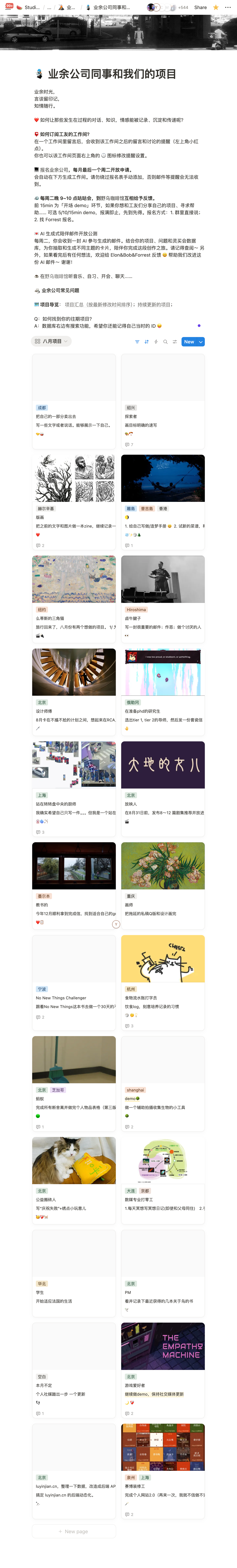 每位业余公司的「工友」都会有一间属于自己的工作间,在 Notion 工作间里更新项目进度;逛逛其他工友项目,留下评论或反馈。看见彼此项目的生长和变化。
