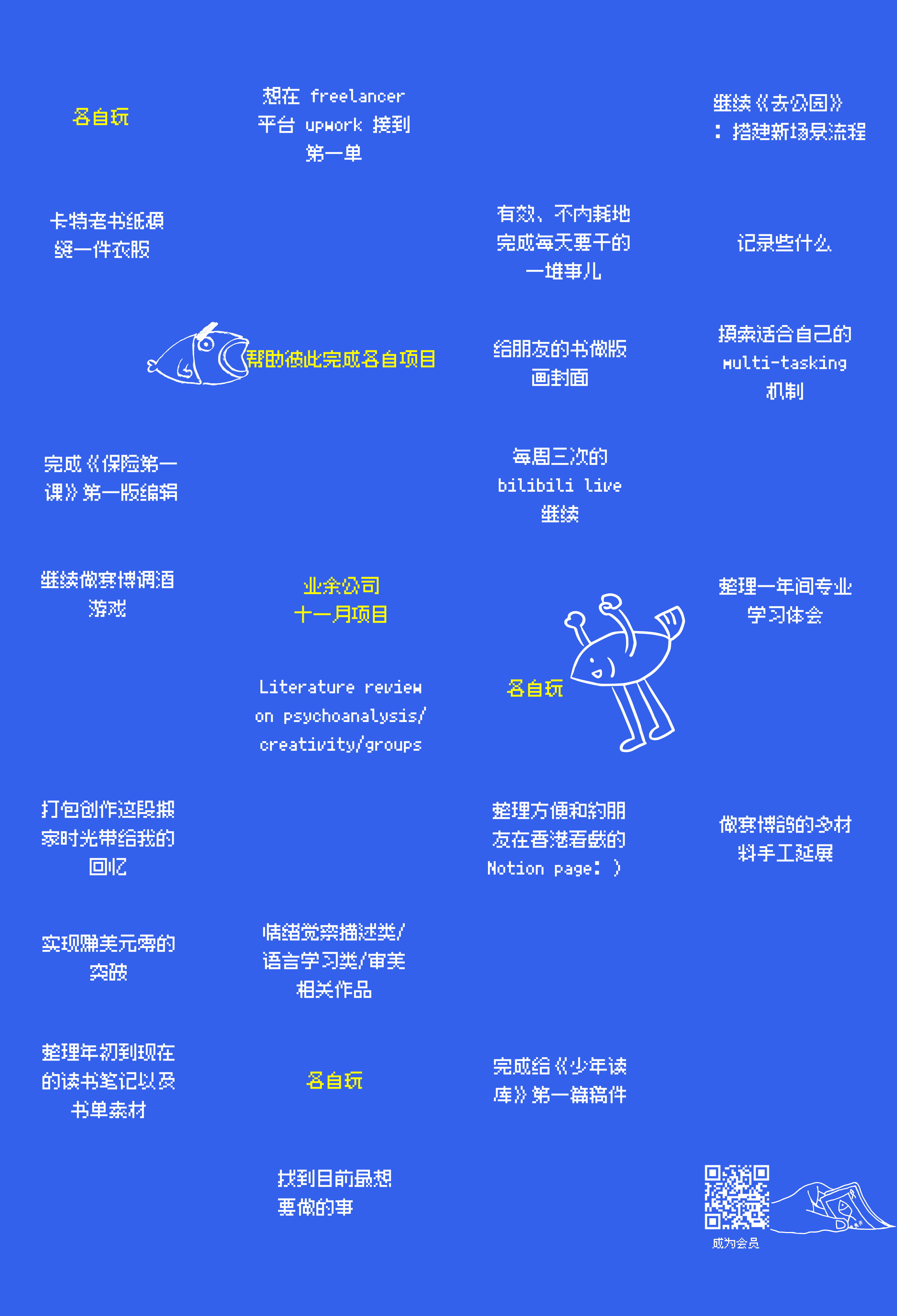 今晚九点到十点是业余公司的第三次咕咕会,欢迎报名了本期业余公司的朋友参与线上碰头,试试「给自己的项目找一个问题」。提问可以是背后的主题式问题,回应自己为何而做;也可以是实践过程中的困惑,一些更直接摆在眼前的、帮助自己理清如何去做的问题。我们互相给予彼此反馈。
