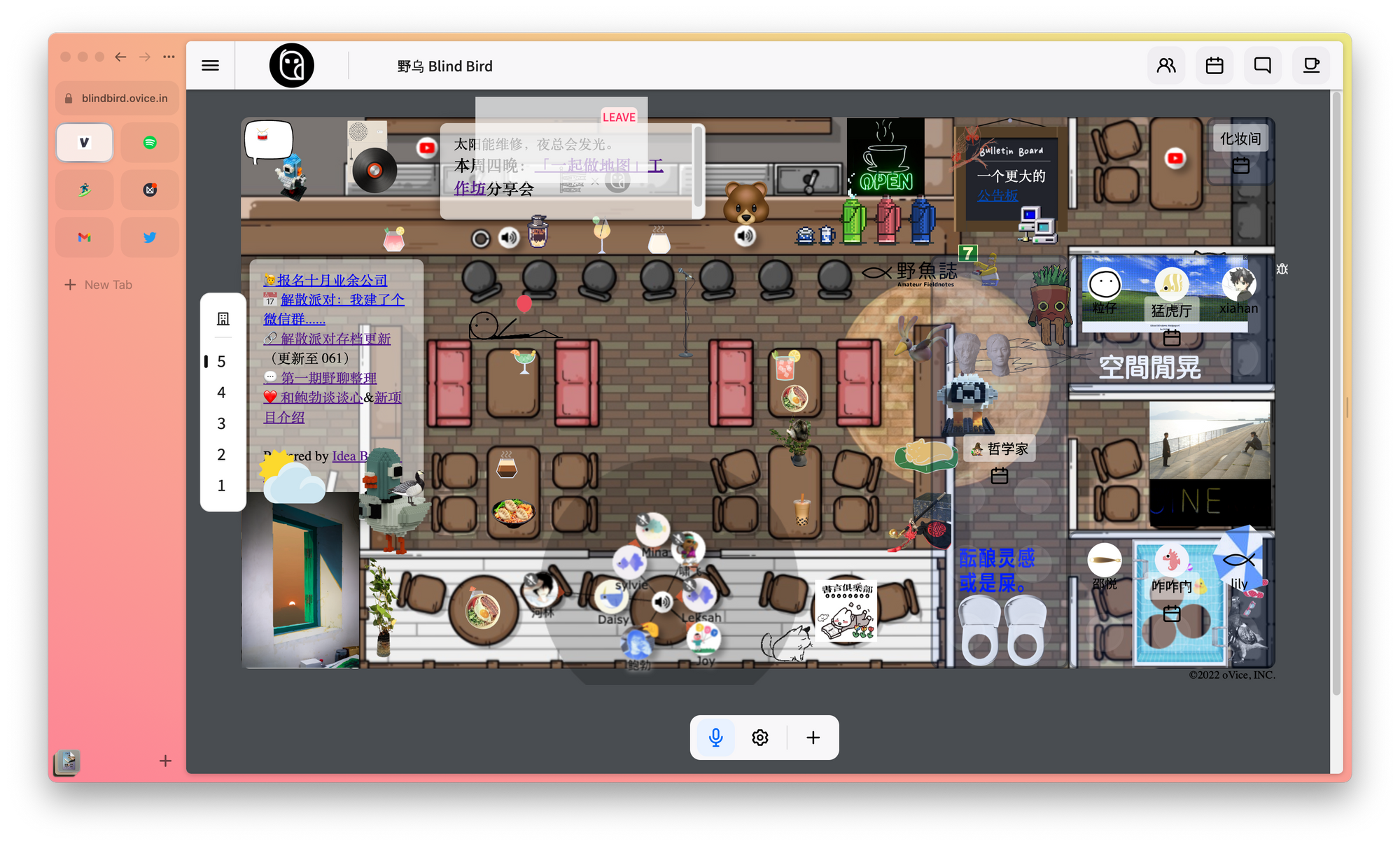 如果你想更实时地感受到彼此,可以来我们的线上咖啡馆坐坐。野乌咖啡馆的地址是:https://blindbird.ovice.in/