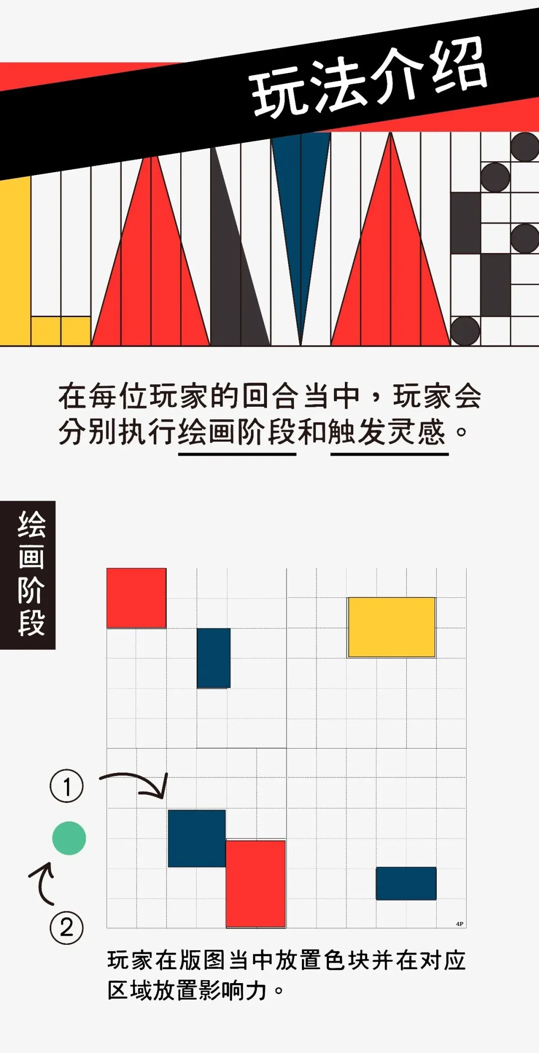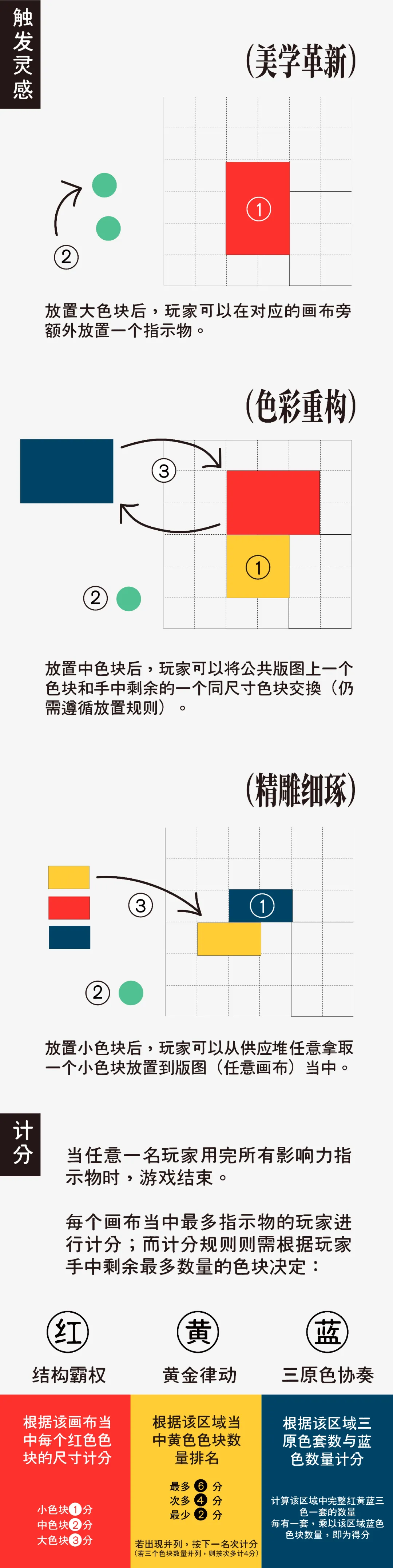 玩家将使用不同尺寸,不同色彩的色块拼贴绘制出一幅蒙德里安风格的作品。尺寸决定着玩家放置板块的功能与效果,色彩则主导审美价值,决定最后的分数。