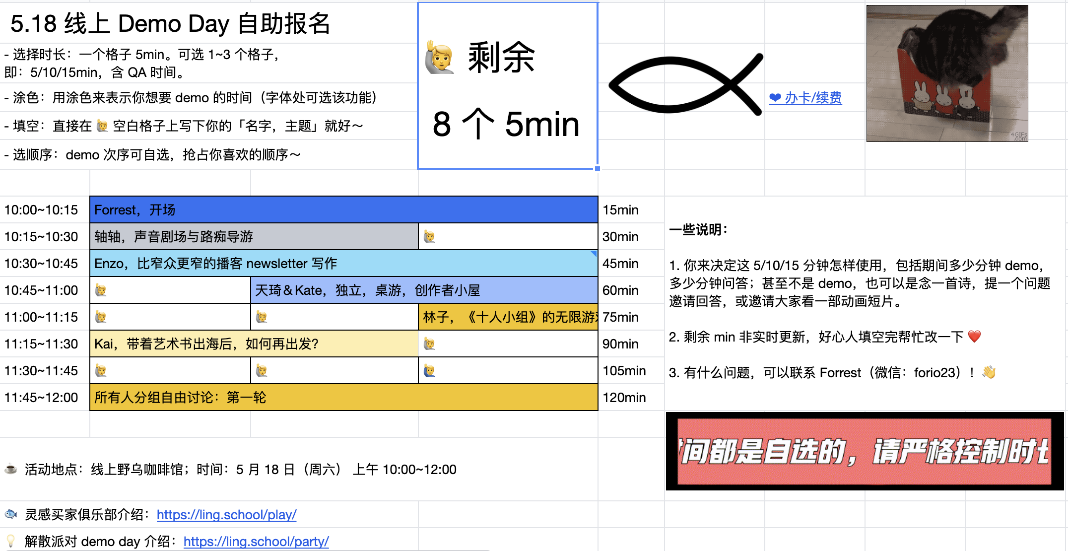 除了上述确定的分享外,这次 Demo Day 剩下的时间会开放给各位来报名 demo。时长可选 5、10、15min,包含 QA 时间。你来决定这 5/10/15 分钟怎样使用,包括期间多少分钟 demo,多少分钟问答;甚至不是 demo,也可以是念一首诗,或邀请大家看一部动画短片。