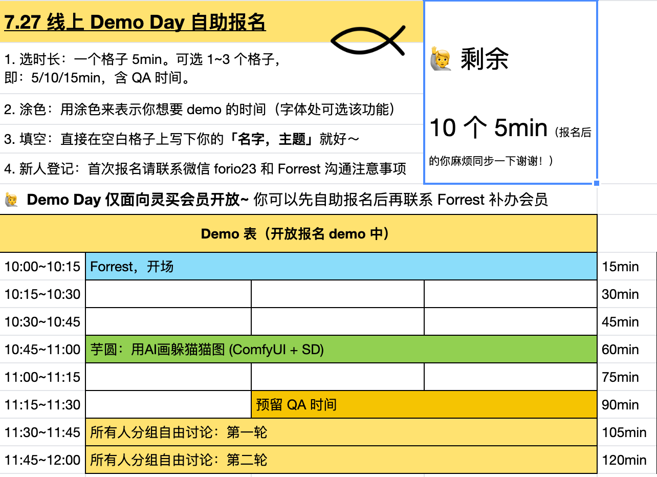 空白格子均可报名,在自助表格内写下你的名字和 demo 主题即可。更多报名指南,你也可以在自助表格里获取: https://playwith.ling.school/demo-day-form