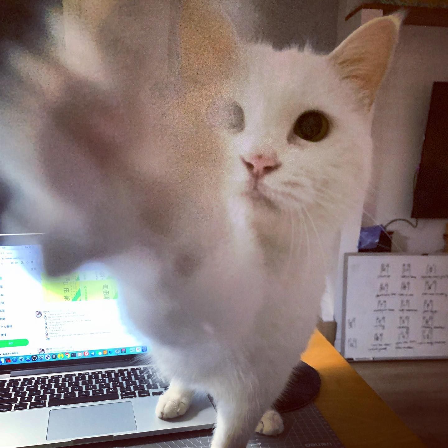 有一只很胖的大白猫,叫波多。波多你也上节目了,开心吗?对,就是我社交媒体头像上的那只猫。