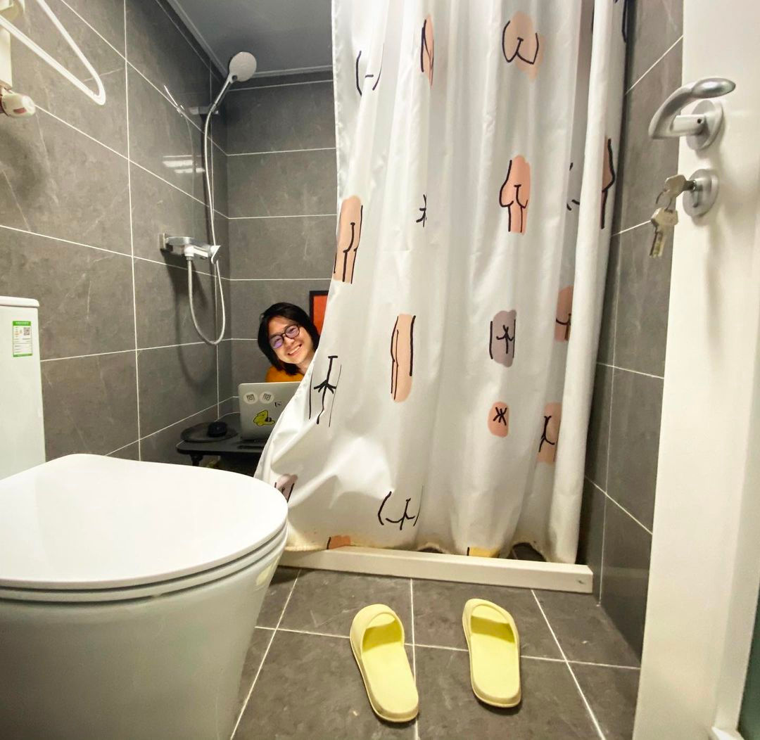 从厕所开始。厕所分干湿区,是黑墙,深色就是休息的颜色。楼下厕所是白色的,相对公开一点。