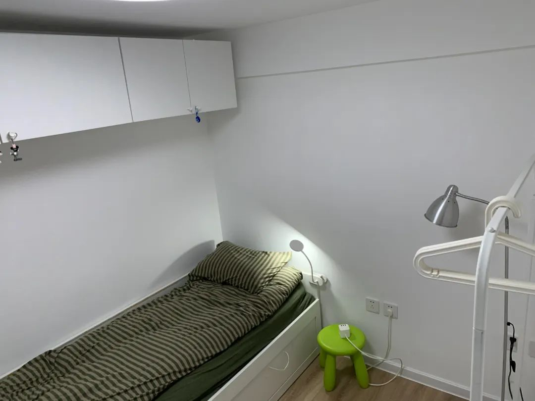 这就是一个小次卧,但是最近我妻子睡在这,因为她腰伤了,只能睡比较硬的床。这是一个宜家的沙发床,可以从单人床变成双人床。有时候客人的话,就可以情侣一起住。