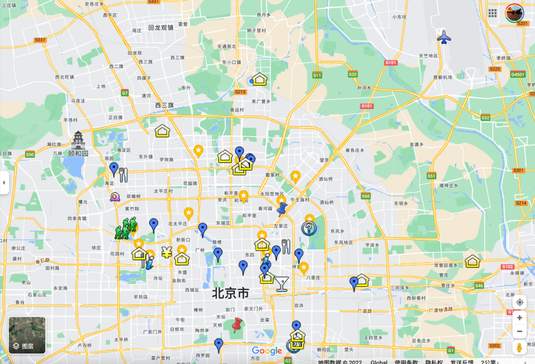 我在北京搬了十几次家,给每次家在 Google 地图上都做了标注。